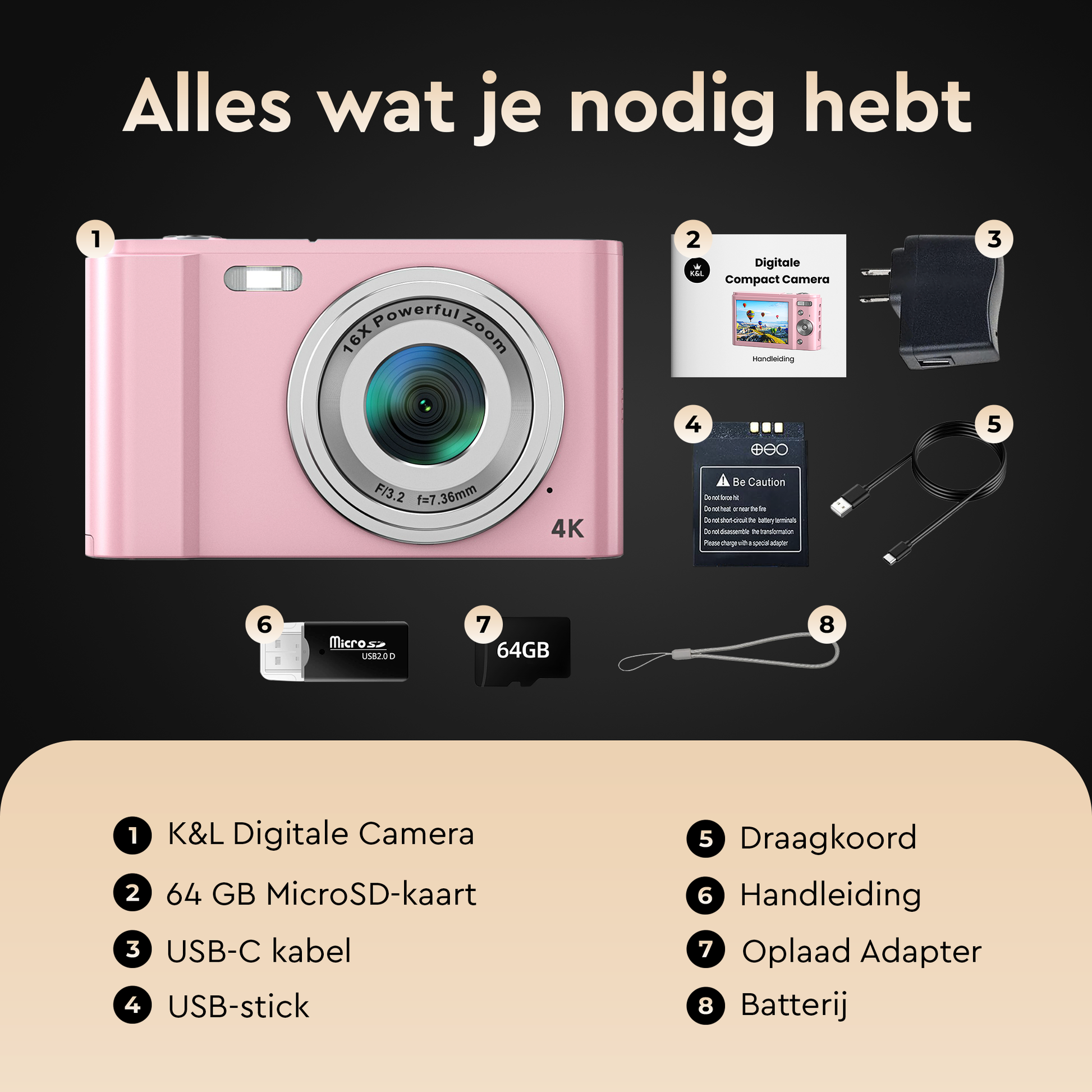 Maak elk moment onvergetelijk met de K&L Digitale Camera 4K – de ideale camera voor gezinnen, jonge creatievelingen en iedereen die graag mooie herinneringen vastlegt. Deze compacte alleskunner is eenvoudig te gebruiken, supersnel klaar voor actie en zit boordevol handige functies. Of je nu gaat filmen, fotograferen of livestreamen – deze camera staat altijd voor je klaar.